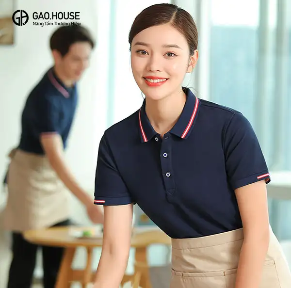 Đại diện cho sự đâm chồi nảy lộc và khởi đầu mới nên hiện nay rất nhiều công ty, doanh nghiệp lựa chọn sắc xanh để làm đồng phục. Với sản phẩm áo nhà hàng GUN1980087, Gạo House lựa chọn màu xanh lam đen để tạo nên điểm nhấn khác biệt cho tập thể nhà hàng. Toàn bộ phần thân áo là màu xanh lam đen khiến cổ áo và cổ tay được line đỏ đô để tạo điểm nhấn cho người mặc.