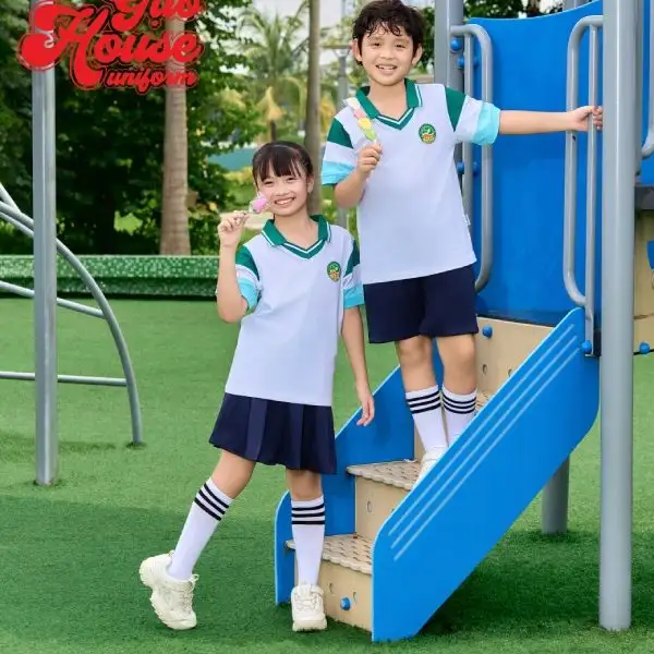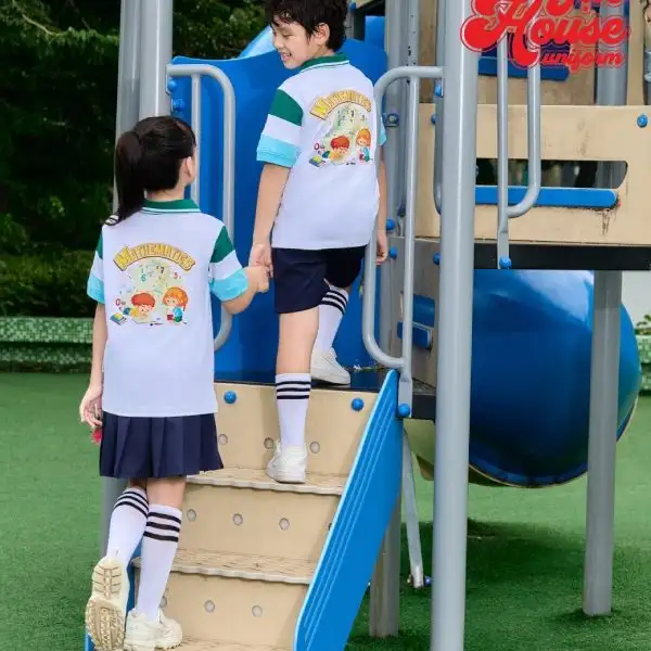 Mẫu áo đồng phục mầm non màu trắng phối cổ tim line xanh lá là thiết kế sáng tạo tại Gạo House. Sự kết hợp hài hòa giữa hai màu sắc này không chỉ mang đến cảm giác tươi trẻ, năng động mà còn giúp các bé luôn nổi bật trong những ngày đến trường. Bên cạnh đó, hình in trên áo mầm non còn được thiết kế tỉ mỉ, sắc nét, thường được đặt ngay ngắn ở vị trí trung tâm ngực hoặc lưng áo, vừa tăng tính thẩm mỹ vừa giúp dễ dàng nhận diện thương hiệu của trường mầm non.
